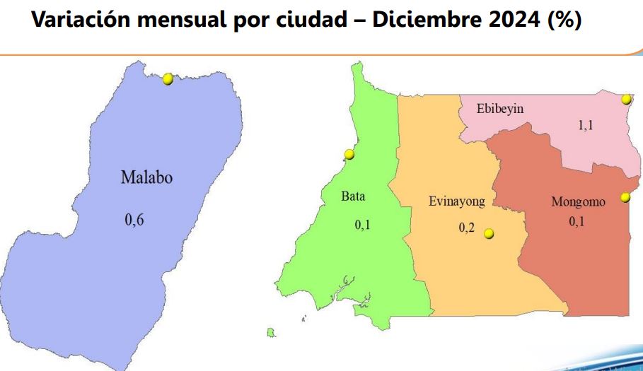 Malabo registra un 3,8%, mientras que Bata alcanza un 3,4%. Evinayong y Ebibeyín muestran niveles más moderados con 2,3% y 1,9%, respectivamente. La inflación subyacente del país se sitúa en un 2,4% en 2024.